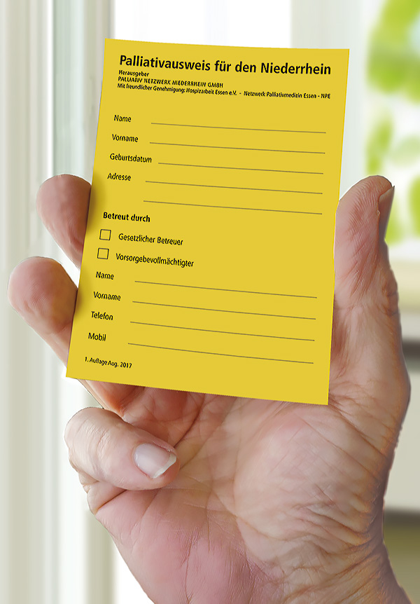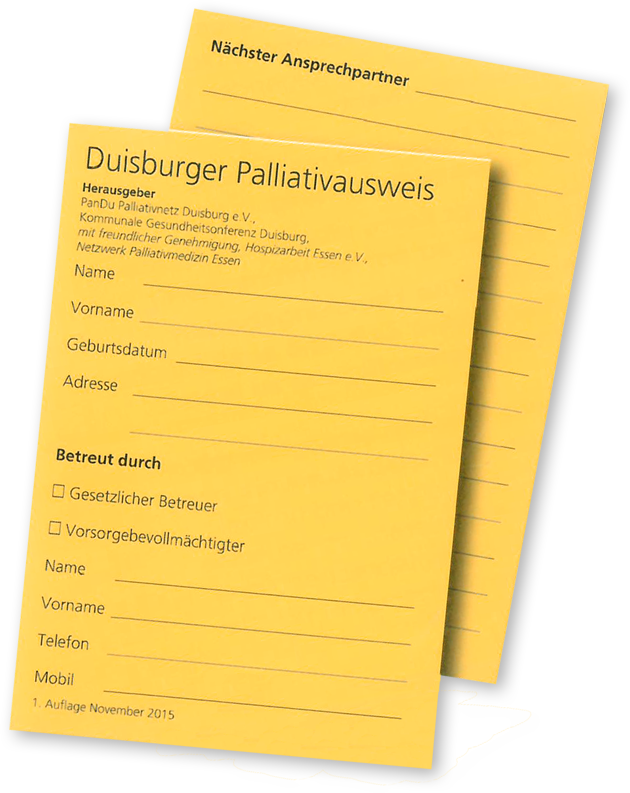 Der "Palliativausweis für den Niederrhein" ist bei uns und beim "Palliativ Netzwerk Niederrhein" zu bekommen.Der "Duisburger Palliativausweis" ist bei den Partnern, die auf der Rückseite des Flyers genannt sind, erhältlich.